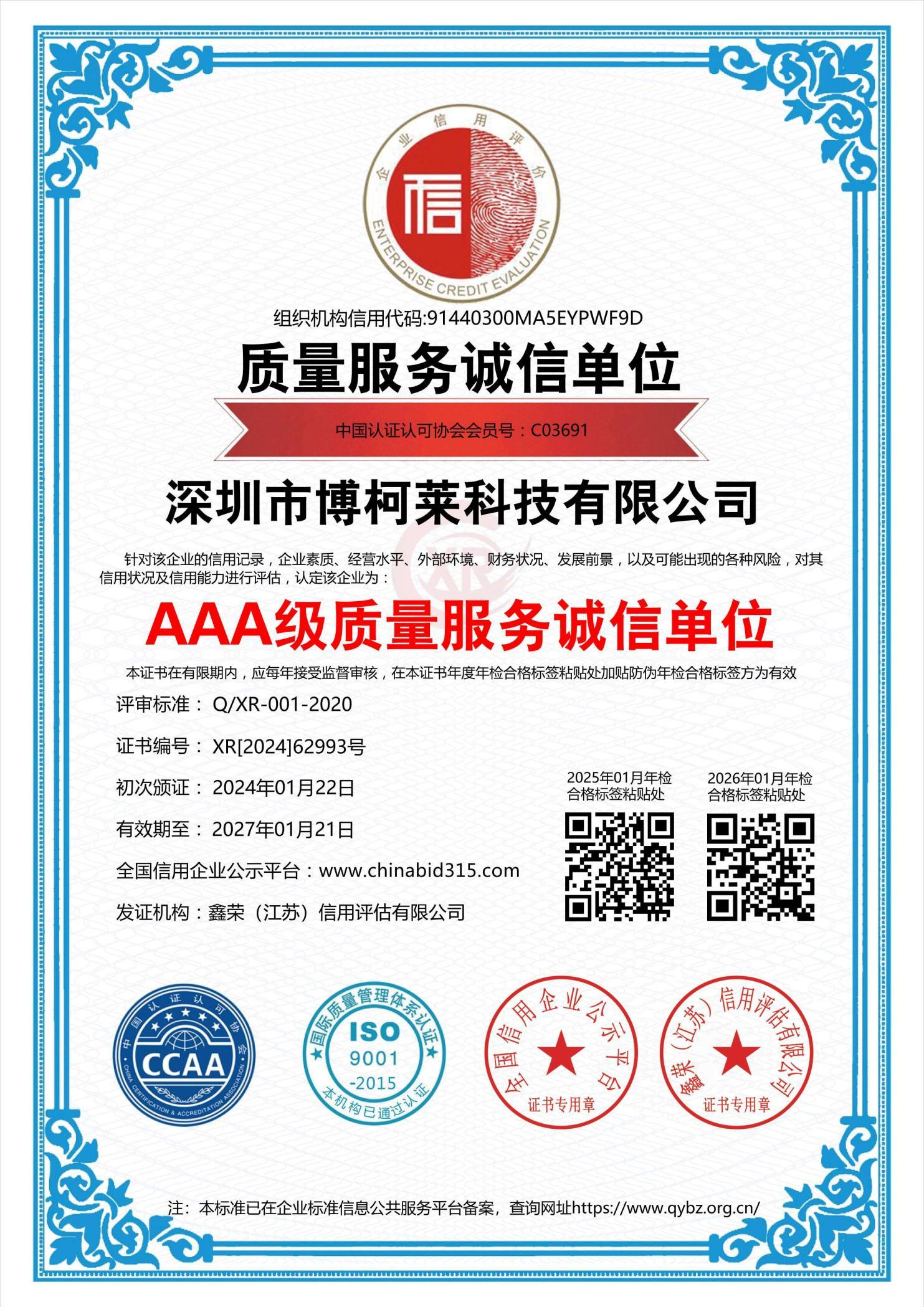 3A级质量服务诚信单位证书